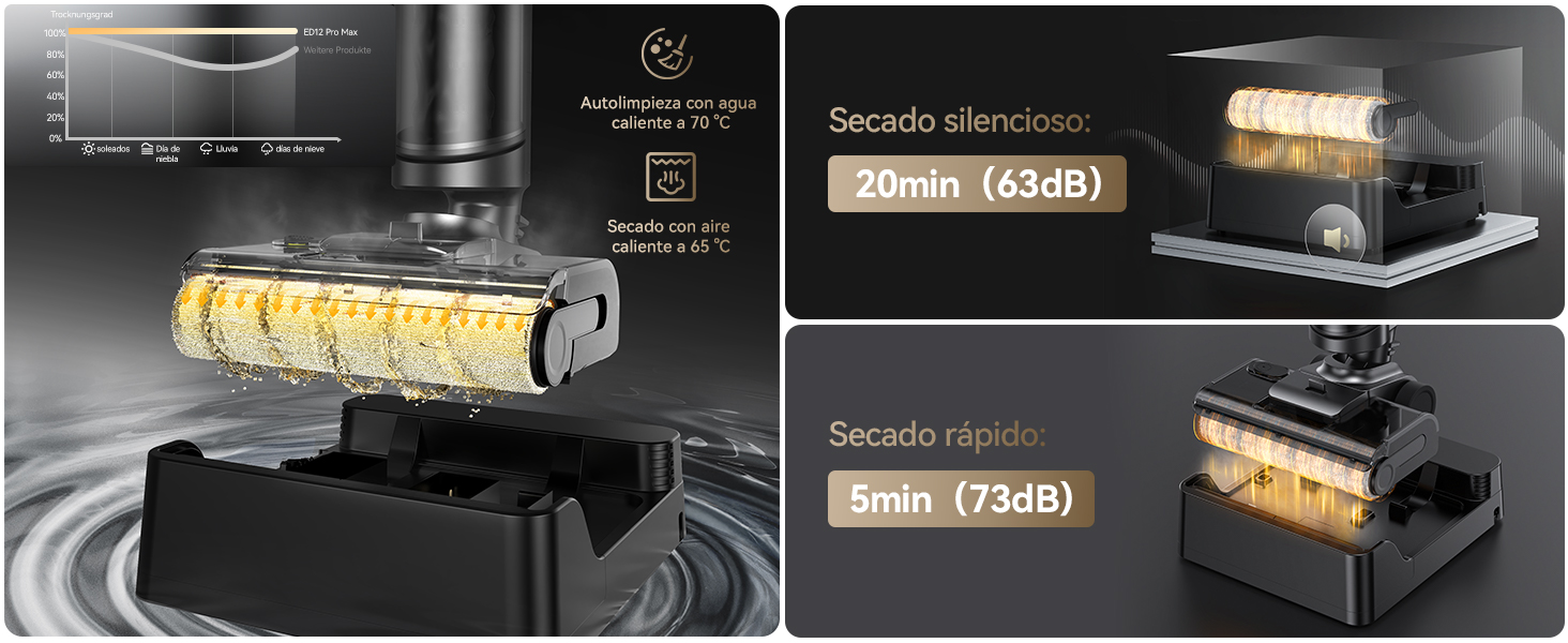 - Autolimpieza a 70°C: Agua caliente a 70°C elimina grasa y manchas con cepillado dual. Secado automático a 65°C con modo rápido (5 min) o silencioso (20 min) para mayor higiene.