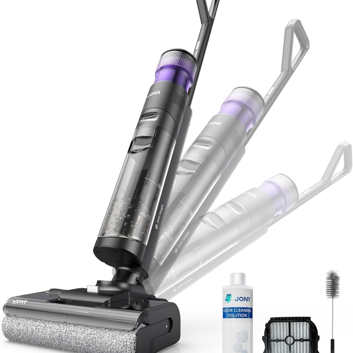 JONR ED12 Pro Max Aspirador Fregona Inalámbrico 2-en-1, Mopa Inteligente Abatible 180°, Autolimpieza con Agua a 70°C, Doble Borde, Anti-Enredos para Pelo de Mascotas,Limpiador Ligero para Suelos Duros