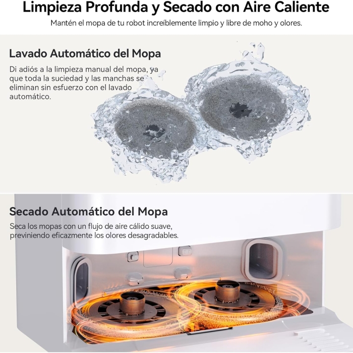 - Limpieza a fregona sin esfuerzo: La fregona autolimpiante del T5 Pro robot aspirador y fregasuelos se lava y se seca de manera automática tras cada uso, garantizando un mantenimiento higiénico y eficiente del suelo sin necesidad de intervención manual.