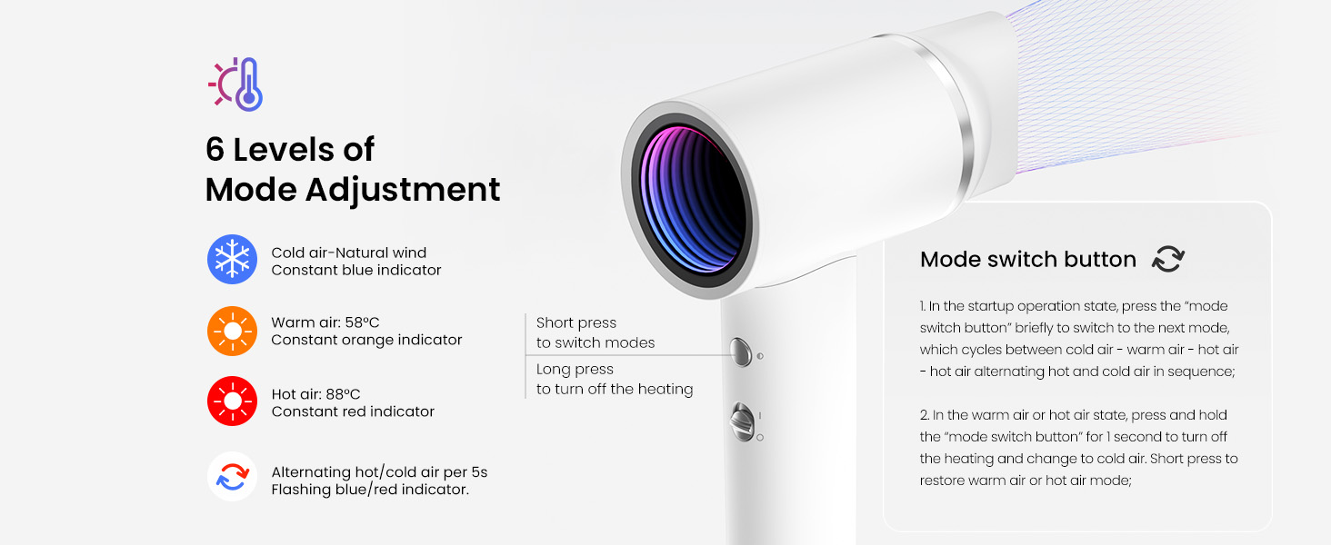 - Diseño de moda: integrando el concepto de diseño del tiempo, la parte posterior del secador de pelo está adornada con un diseño de espejo. Crea un sentido de visión más fuerte con iluminación RGB y un deslumbrante efecto de espejo infinito.